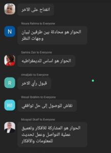 عند طرح السؤال على المشاركين/ات، تنوعت الإجابات بشكل لافت، مما يعكس ثراء المفهوم وتشعبه إذ قالت إيمان “الحوار هو انفتاح على الآخر دون شروط مسبقة، حتى لو اختلفنا جذريًّا”،و أضافت شذى أنه “عملية تبادل وجهات نظر بهدف الوصول إلى حل توافقي، وليس إثبات تفوُّق رأي على آخر”.
